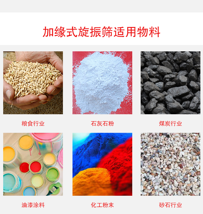 加緣式旋振篩適用于對粉體、顆粒狀、纖維狀物料或漿料進行干式入濕式篩選分級,屬新型高精度細粒篩分設備。